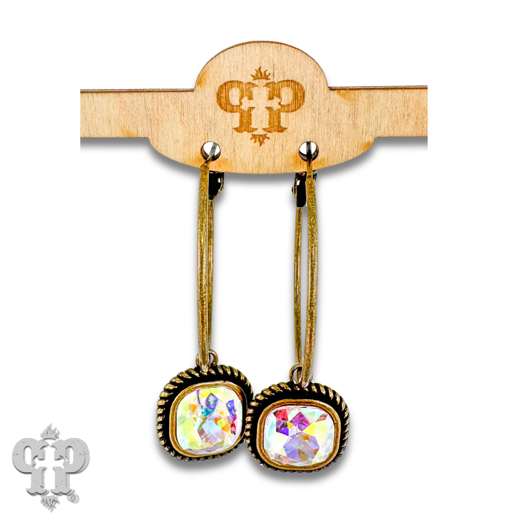 This earring has a rope edge look setting with an AB (iridescent) square crystal on a medium, 35mm, hoop earring. Product details * Rope looking setting * Sparkling iridescent square stone * Approximately 2.5 inches in length
