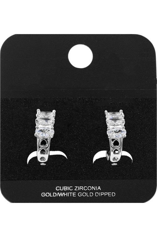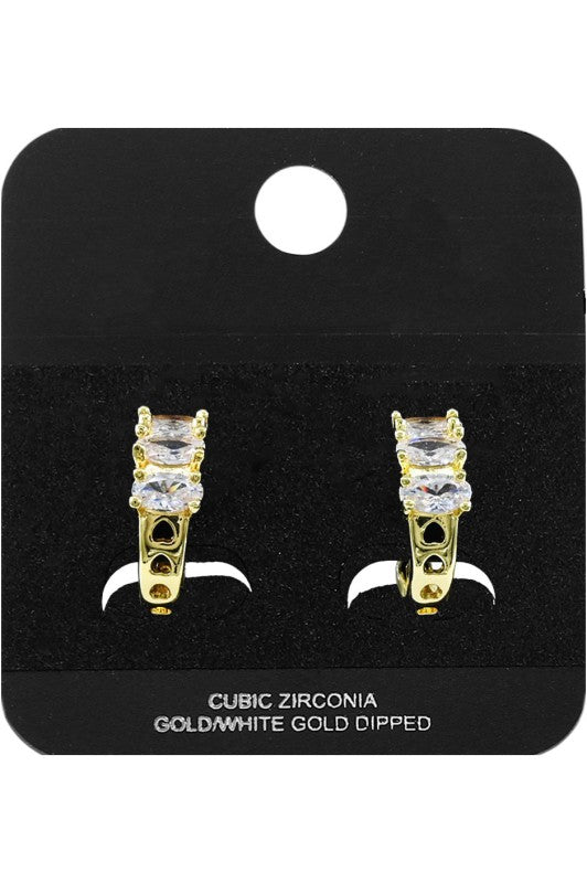 Post Back Modern hoop earrings featuring three round cubic zirconia stones set along a sleek curved silhouette. Designed for maximum sparkle and everyday comfort, these refined hoops add brilliant shine to casual looks or evening outfits, making them a must-have addition to any jewelry collection. CZ Cubic Zirconia Gold Dipped Lead and Nickel Compliant White Gold Dipped Triple CZ Stone Cluster Accent Mini Open Hoop Earrings Gold Dipped Triple CZ Stone Cluster Accent Mini Open Hoop Earrings