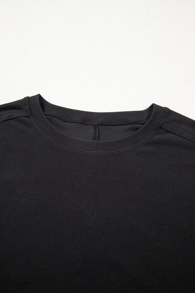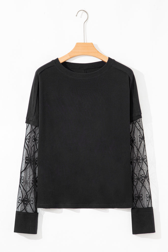 Featuring a solid tee body and sheer long sleeve patchwork.