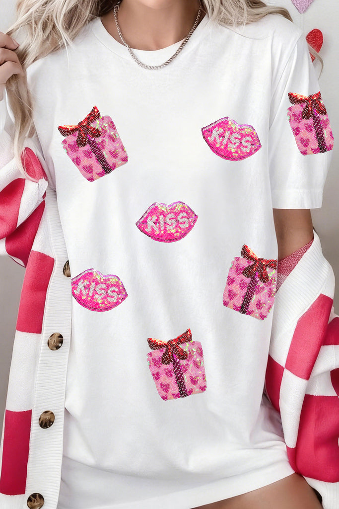 White Valentines Gift Kiss Lip Sequin Graphic T Shirt