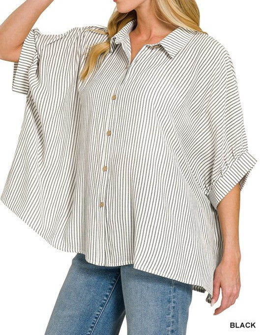 WOVEN STRIPE BUTTON DOWN BOXY TOP - CURVED HEM - FRONT BUTTON CLOSURE - OVERSIZED FIT TOTAL BODY LENGTH: 25.5", BUST: 67" approx. - MEASURED FROM S/M * COLOR MAY VARY SLIGHTLY DUE TO MONITOR RESOLUTION